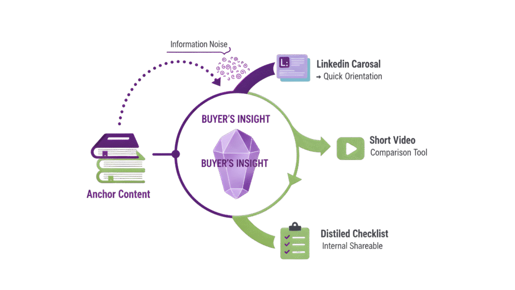 An anchor piece works when it helps them understand the landscape before they commit to depth. That’s why buyers often scan an article, cross-reference it with other tabs and gravitate toward condensed versions of the same idea. This is usually summaries, visuals or quick checklists. Repurposing meets them in this natural motion.