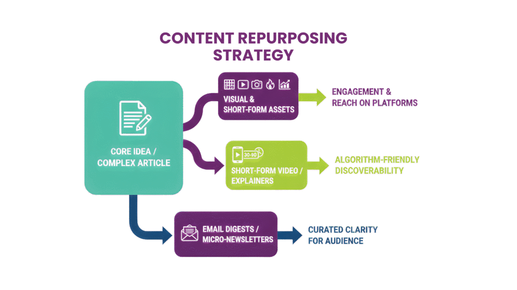 Repurposing into visual and snackable assets expands your total addressable surface area without diluting message integrity.