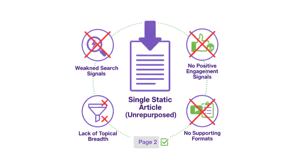This is how a strong page slips from top-five visibility to page two without any direct error. It simply wasn’t supported with derivative formats that continually refresh authority and strengthen topical breadth.