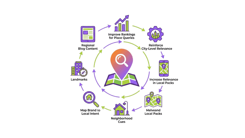 They mention landmarks, districts, and familiar neighbourhood cues. These signals reinforce city-level relevance in search results. They help search engines map your brand to local intent.