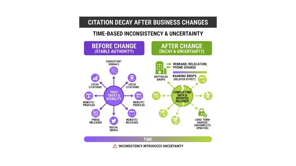 Businesses evolve faster than citation networks. Rebrands, relocations, phone changes, or service updates introduce time-based inconsistency into the ecosystem. During this period, search engines detect conflicting information and reduce reliance on the affected entity.