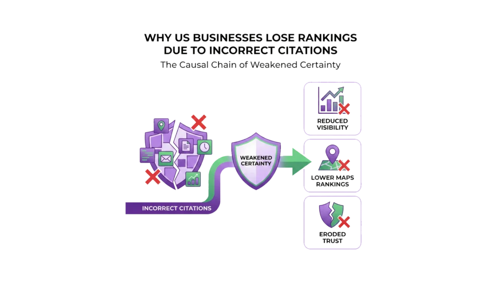 Once trust mechanics and service limitations are understood, ranking drops stop feeling unpredictable. They follow a clear causal chain tied to how search engines validate business entities at scale. Incorrect citations do not trigger penalties; they weaken certainty. When certainty drops below a threshold, visibility is reduced to protect result quality.