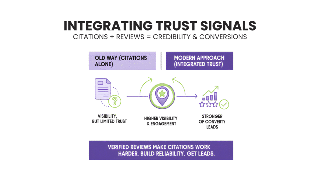 Combined citations and reviews show search engines your business is reliable.