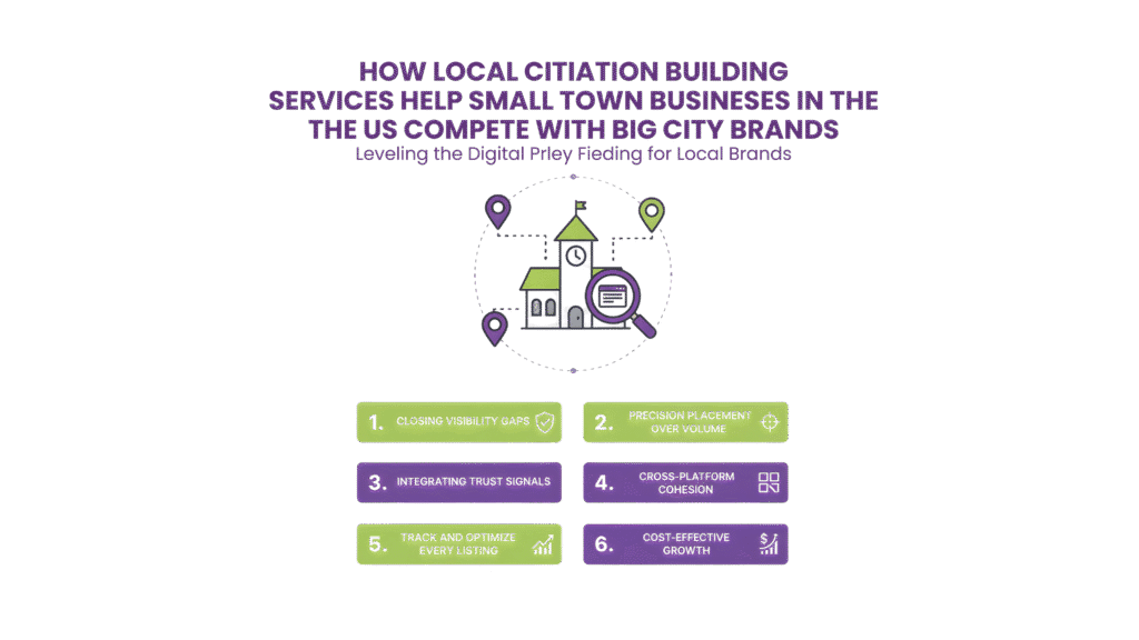 Local citation building services list your business information on trusted directories and platforms. For small-town businesses, they improve online visibility, help customers find accurate details, and boost local SEO. This increases credibility, search rankings, and competitive edge against bigger city-based brands in nearby searches.