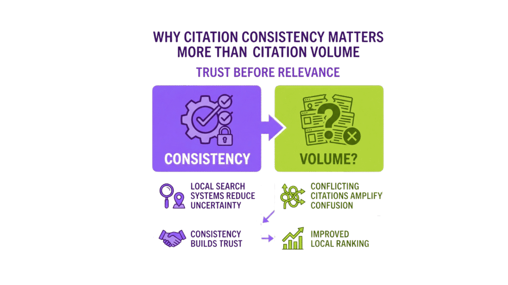 Local search systems are designed to reduce uncertainty, not reward abundance. While many citation strategies still emphasise scale, volume alone does not help a system interpret a business more confidently. In fact, when citations conflict, increased coverage can amplify confusion rather than resolve it. Consistency matters because local search depends on trust before relevance or competition is evaluated.