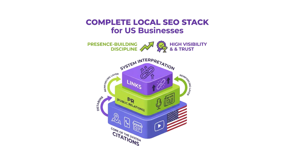 Once system interpretation and fragmentation risks are understood, local SEO stops being a checklist exercise and becomes a presence-building discipline. US businesses that perform consistently in local search do not run citations, links, and PR as separate tactics. They treat them as one reinforcing layer that helps search engines and users reach the same conclusion at the same time.