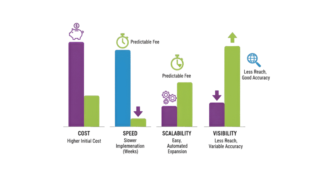 Let’s first take a look at the cost implications of each method, as this factor can significantly influence the ROI for businesses, depending on their size and resources.