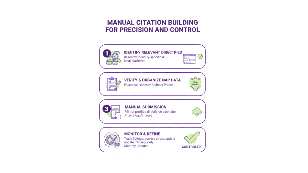 Manual citation building gives you full control over every listing. It makes sure your business appears accurately in hyper-local directories, with precise descriptions and targeted keywords. This builds trust with both customers and search engines, making it ideal for small businesses or single-location operations.