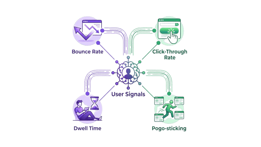 Search engines incorporate user behavior data, such as click-through rates (CTR), bounce rates, dwell time, and repeat visits, to gauge how effectively a page satisfies user needs. When your content fails to engage users, search engines may interpret that as a sign that it’s not fully meeting expectations for that query.