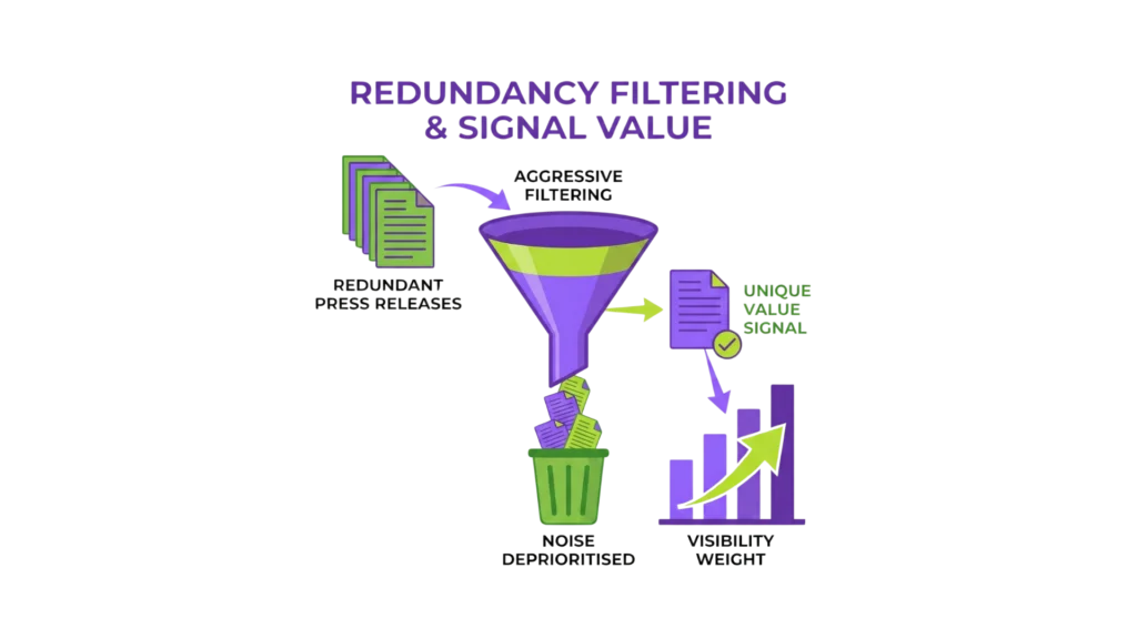 This does not mean press release marketing is ignored. It means that visibility weight declines when releases fail to add new interpretive value. Each release is assessed relative to prior ones. When nothing meaningfully changes, the signal contribution weakens. Redundancy increases noise, and noise is deprioritised.