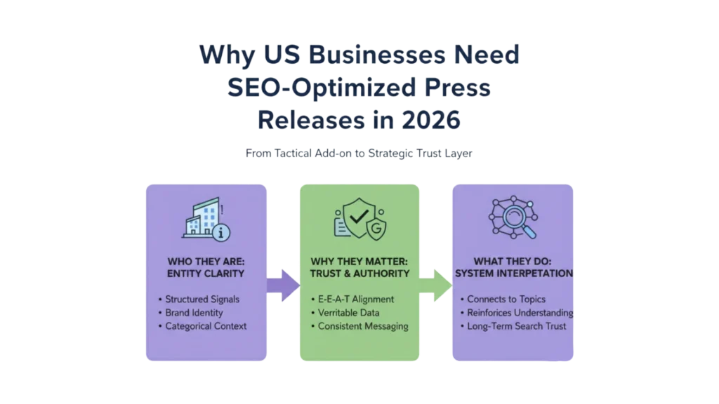 Once system interpretation and legacy limitations are clear, SEO-optimized press releases take on a very different role. They are no longer issued to “rank” or to chase temporary visibility. In 2026, US businesses use press releases as structured signals that help Google understand who they are, what they operate in, and why they matter within a category.