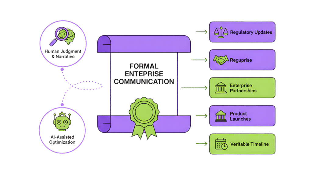 Press releases remain the formal backbone of enterprise communication. Situations that demand official, recordable announcements include regulatory updates, compliance news, product version launches, enterprise partnerships, and funding rounds.