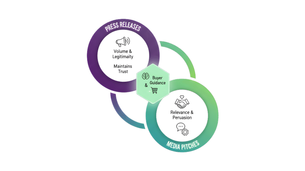 In comparison to press releases, which primarily anchor legitimacy, pitches transform announcements into actionable intelligence that drives trust, awareness, and consideration across the buyer journey.