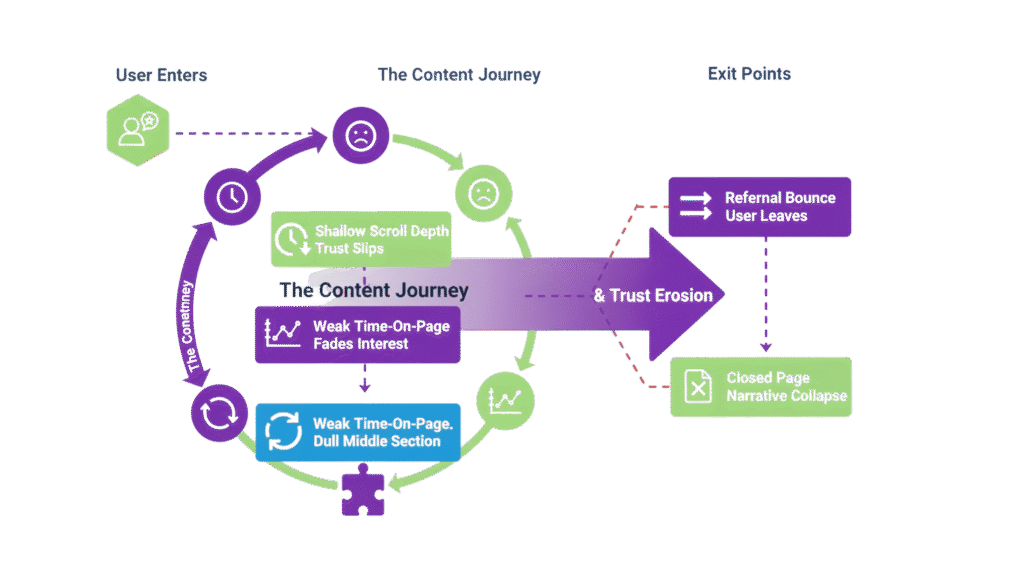 Shallow scroll depth reveals early disappointment. Weak time-on-page shows a dull middle section. Referral bounces reveal broken continuity.