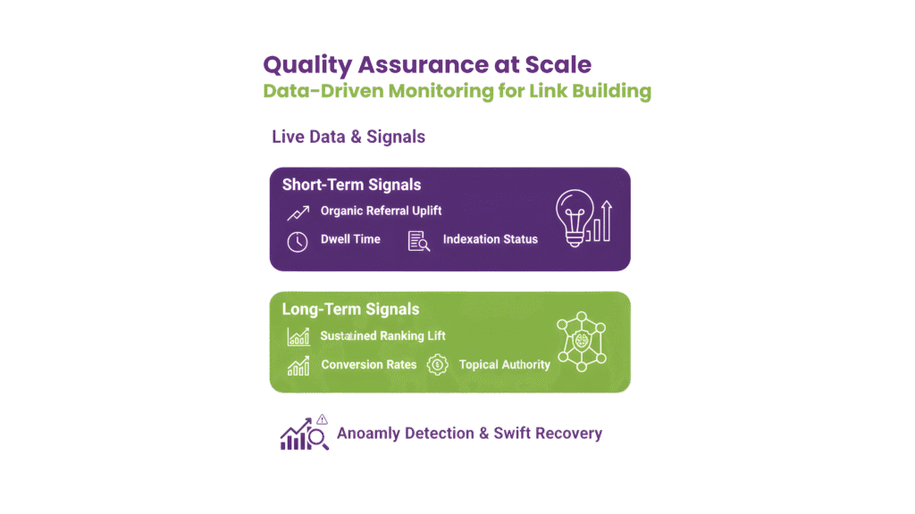Short-term signals include organic referral uplift, dwell time from referred visitors, and indexation status. These metrics reveal whether links are being discovered, read, and retained by search engines.