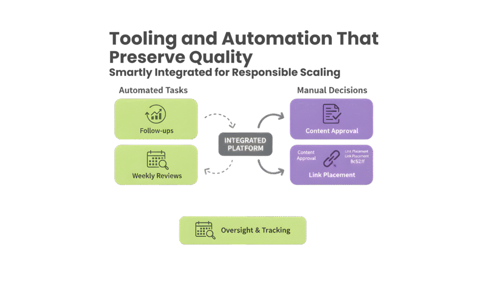Repetitive and replicable tasks like follow-ups and reporting can be automated easily. However, critical decisions like content approval or link placement remain manual. These experts also conduct weekly operational reviews and monthly KPI reports to track outcomes and efficiency.