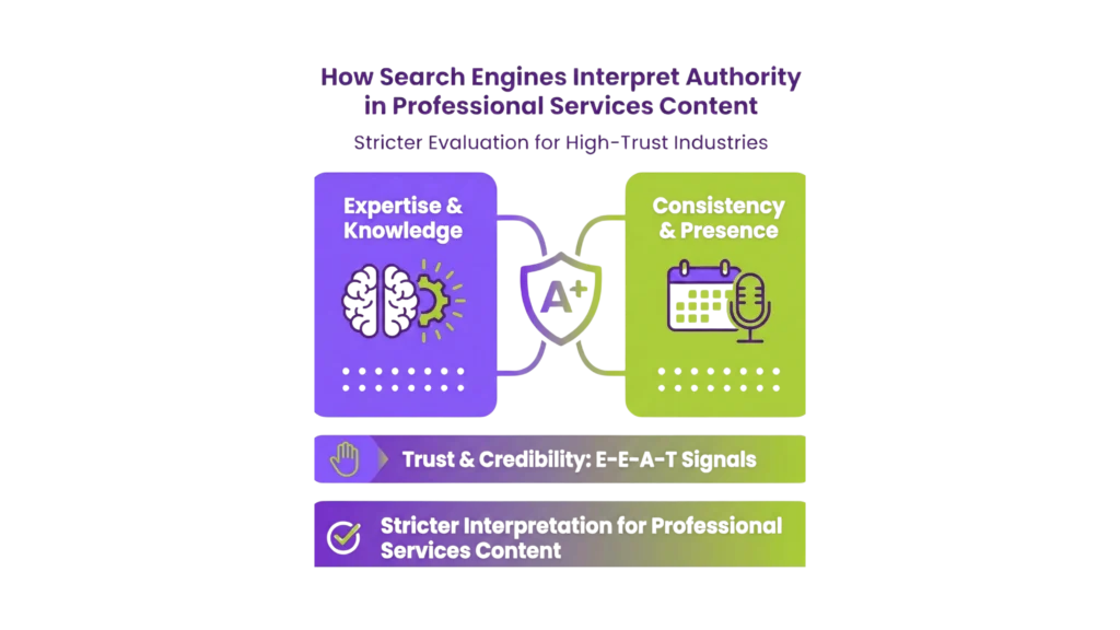 Professional services content is evaluated inside a stricter trust framework than most commercial material. Search engines apply this lens because the consequences of misinformation are higher in advisory, legal, financial, and consulting contexts. Before relevance or rankings are considered, the system assesses whether a source demonstrates stable judgment, clear boundaries, and intellectual reliability over time. This is why authority in seo content marketing services behaves differently for professional firms.