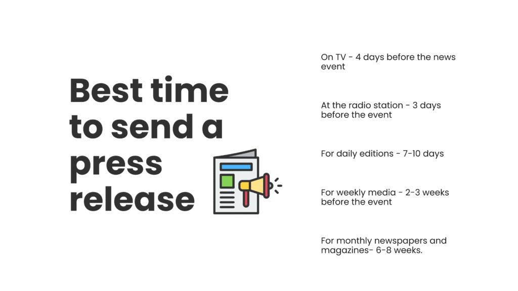 Releases perform the best when they land at the right moment. Your media team should coordinate with journalists for announcements with industry events, product cycles, or breaking news windows.