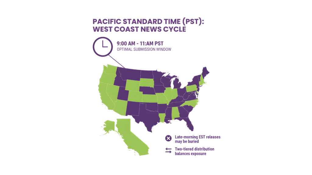 This means late-morning East Coast releases may already be talked over and buried by then. Scheduling two-tiered distributions can help balance exposure across coasts.